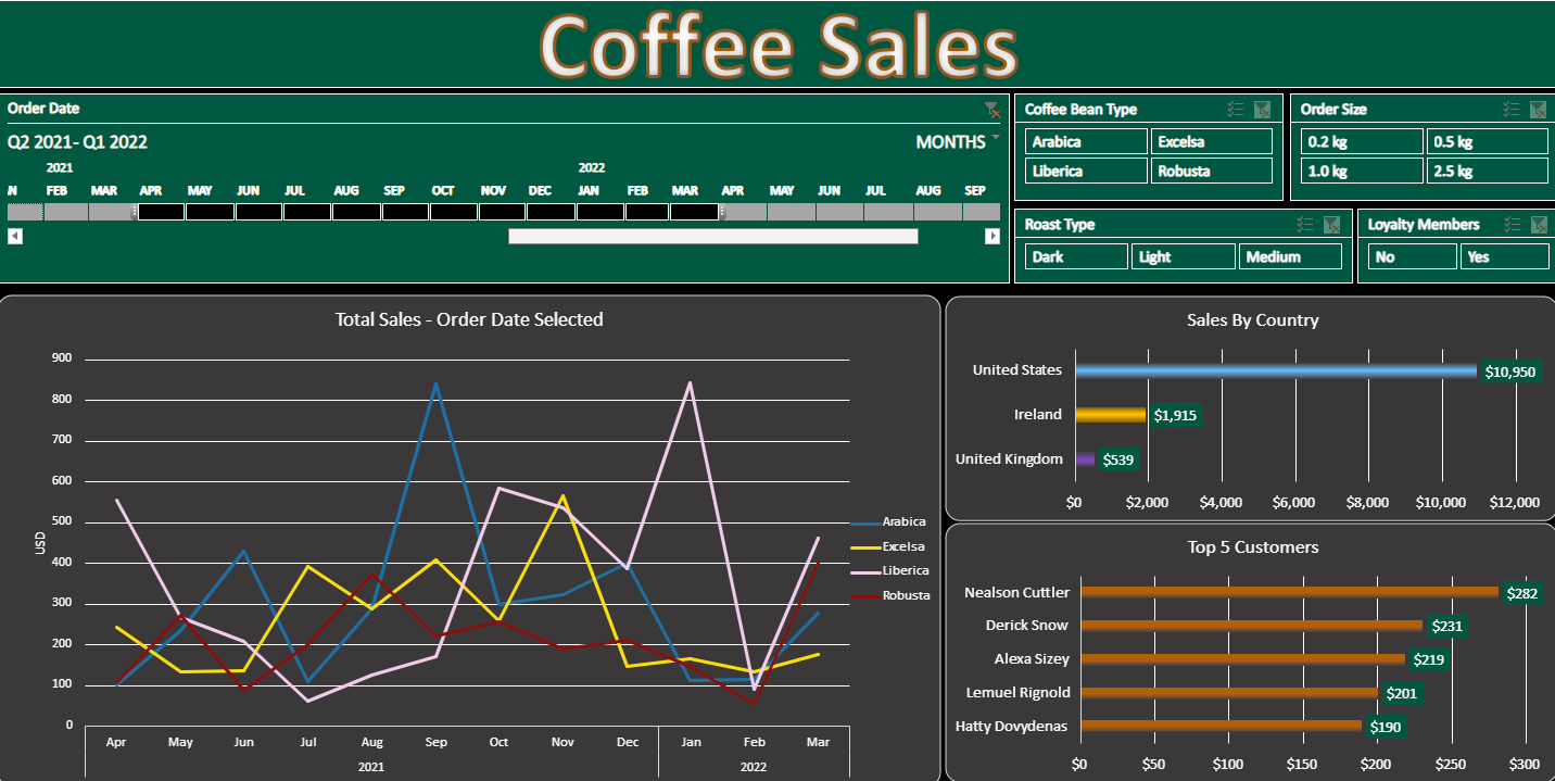 Built an interactive Excel dashboard to analyze coffee sales performance across revenue, customer segments, and product trends.
