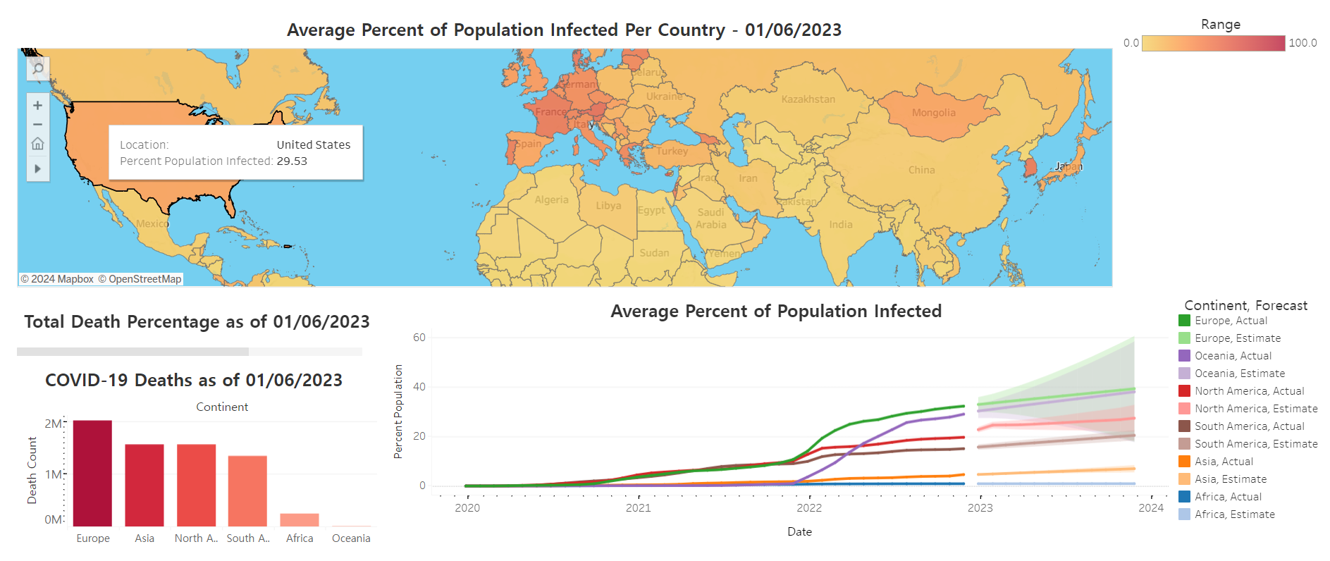 Developed an interactive Tableau dashboard to visualize global COVID-19 infections and deaths across countries and continents.